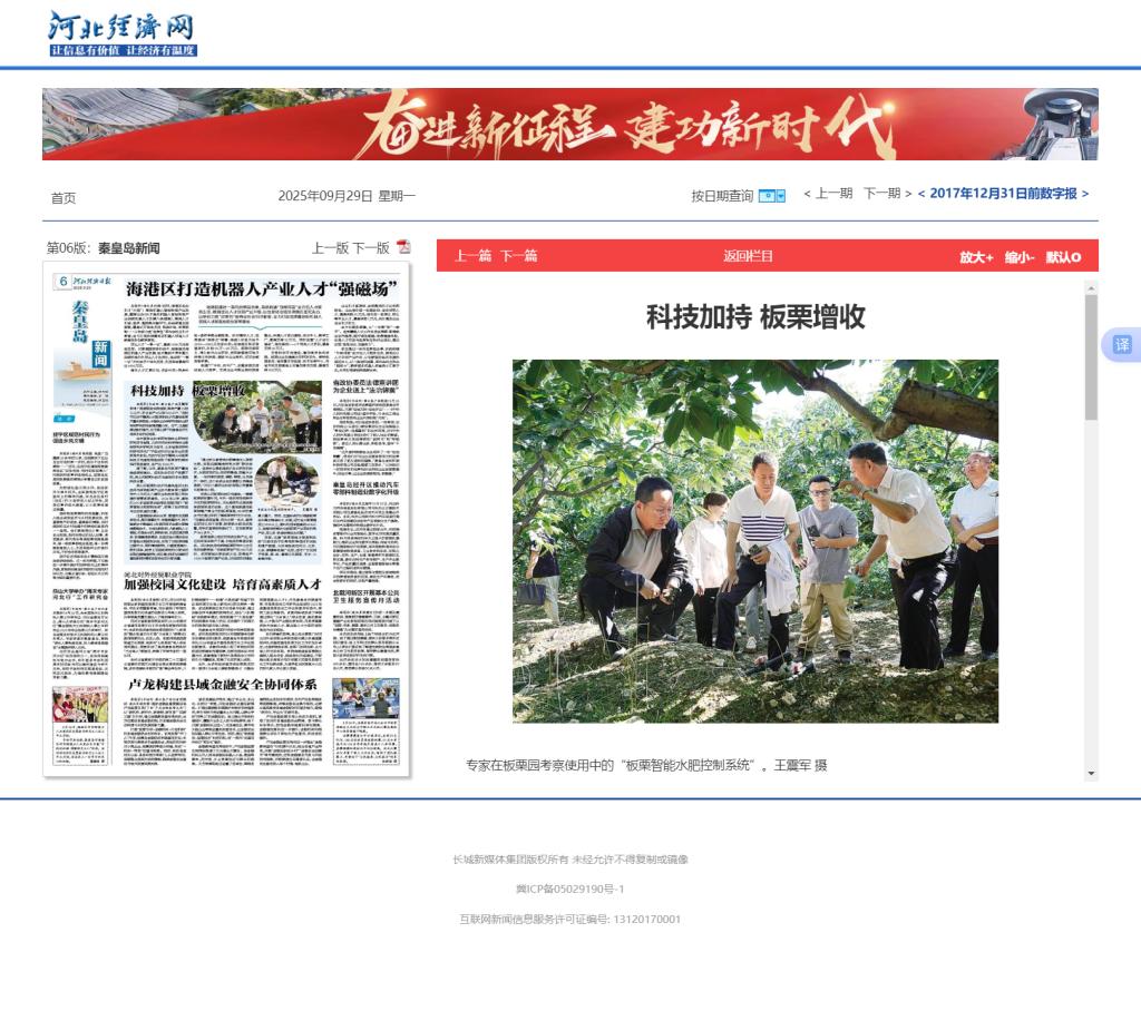 2025年9月29日,《河北经济日报》第六版,秦皇岛新闻以“科技加持 板栗增收”为题,对板栗产业技术教育部工程研究中心与河北八德农业科技有限公司共建的英山河智慧板栗科技示范基地,于2024年以来基地内200多亩板栗试验园采用国内首个“板栗智能水肥控制系统”,取得了经济效益与生态效益的双赢情况进行了宣传报道。
