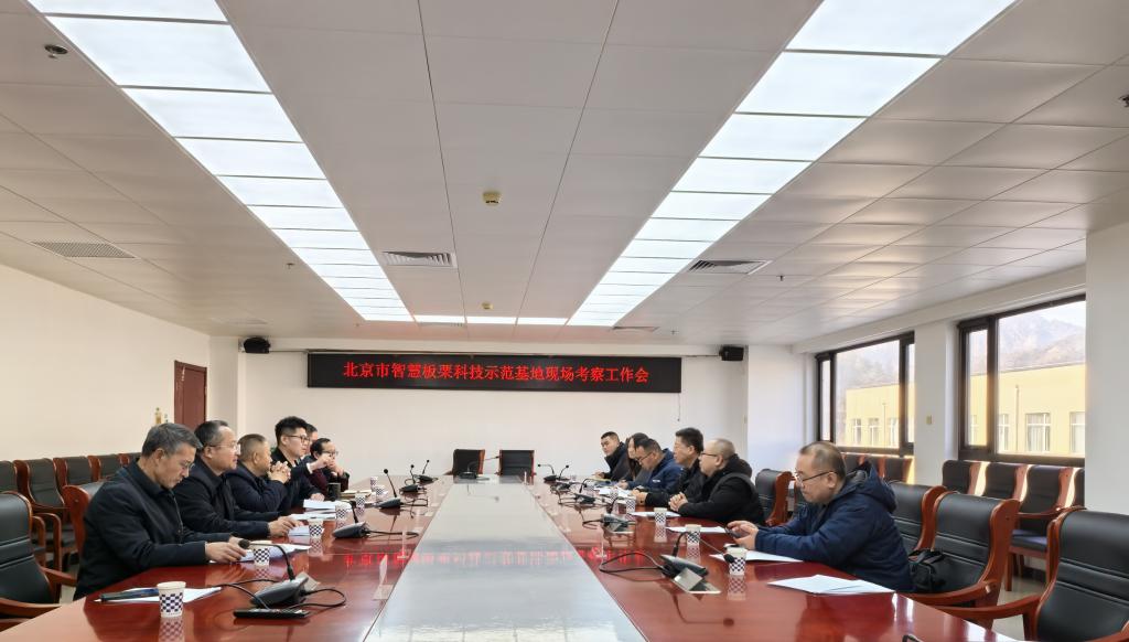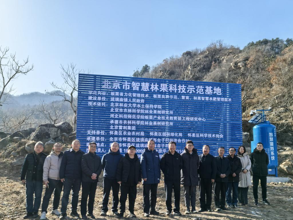 2025年11月28日,北京市园林绿化局产业发展处三级调研员张俊民、产业发展中心林果花卉科科长陈浩一行,莅临我校板栗产业技术教育部工程研究中心(以下简称“板栗中心”)位于北京市怀柔区琉璃庙镇西台子村的智慧板栗科技示范基地,开展实地考察与工作指导、座谈交流。怀柔区园林绿化局副局长刘超杰、板栗站站长刘振丽,怀柔区农业农村局政策调研与产业发展科王熙浓,琉璃庙镇副镇长张金亚、林业站站长唐云飞,西台子村书记高海龙,河北省林业和草原局政策法规处副处长刘辉,我校板栗研究中心主任张京政,河北八德农业科技有限公司董事长赵锁生,国家林业和草原局林草乡土专家陈国正等陪同考察。